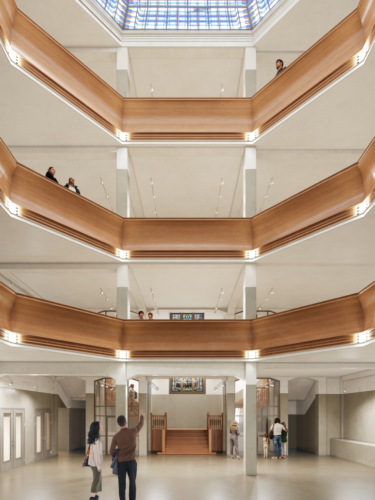 Magazijn De Zon wordt herontwikkeld tot een duurzaam pand waarin de allure wordt teruggebracht en monumentale details worden gekoesterd. De indrukwekkend lichtkoepel, het centrale trappenhuis met de eikenhouten lambrisering en het glas-in-lood dragen bij aan de unieke charme van dit pand.